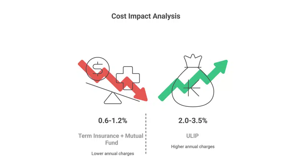 During a personal finance workshop I attended last year, the presenter demonstrated that a ₹1 lakh annual investment in a typical ULIP would accumulate approximately ₹8-12 lakh less over 20 years compared to a term insurance plus direct mutual fund approach, primarily due to the difference in cost structures.
